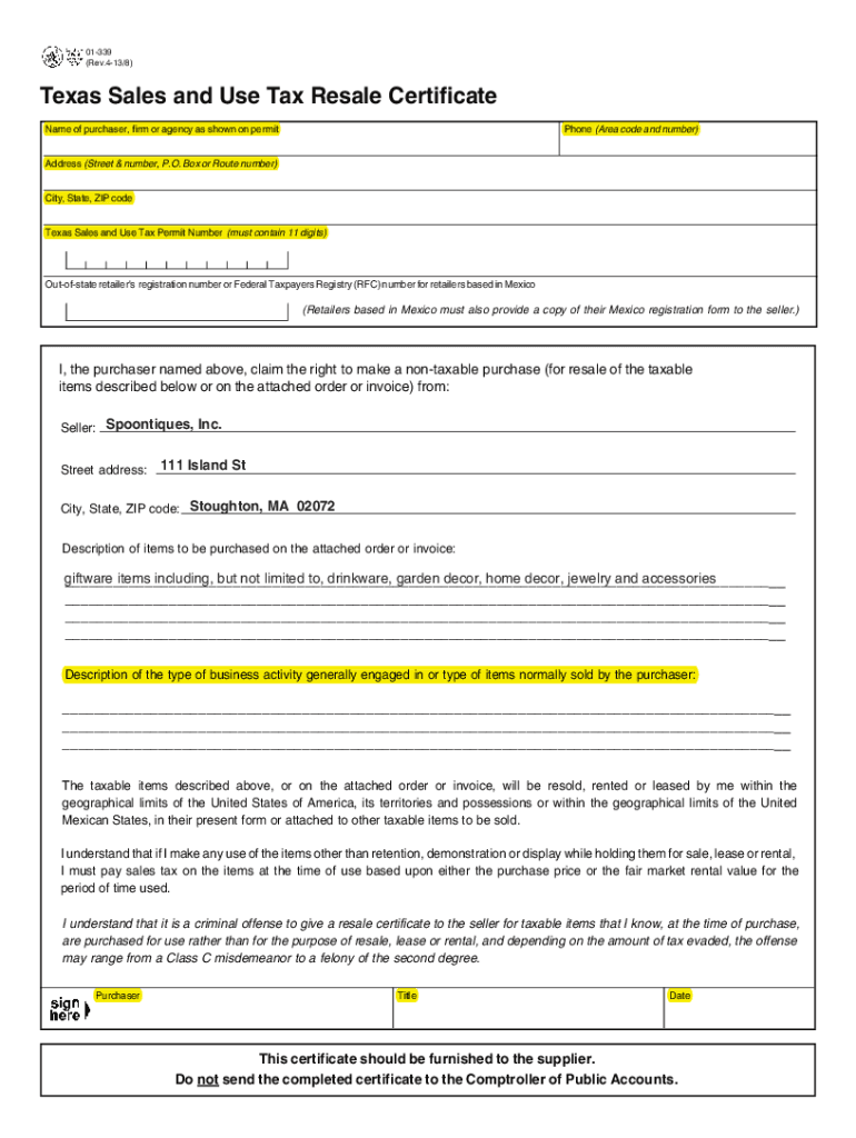 01339 (Rev.413/8)Texas Sales and Use Tax Resale Certificate Name of purchaser, firm or agency as shown on permitPhone (Area code and number)Address (Street & number, P.O. Box or Route number)City,