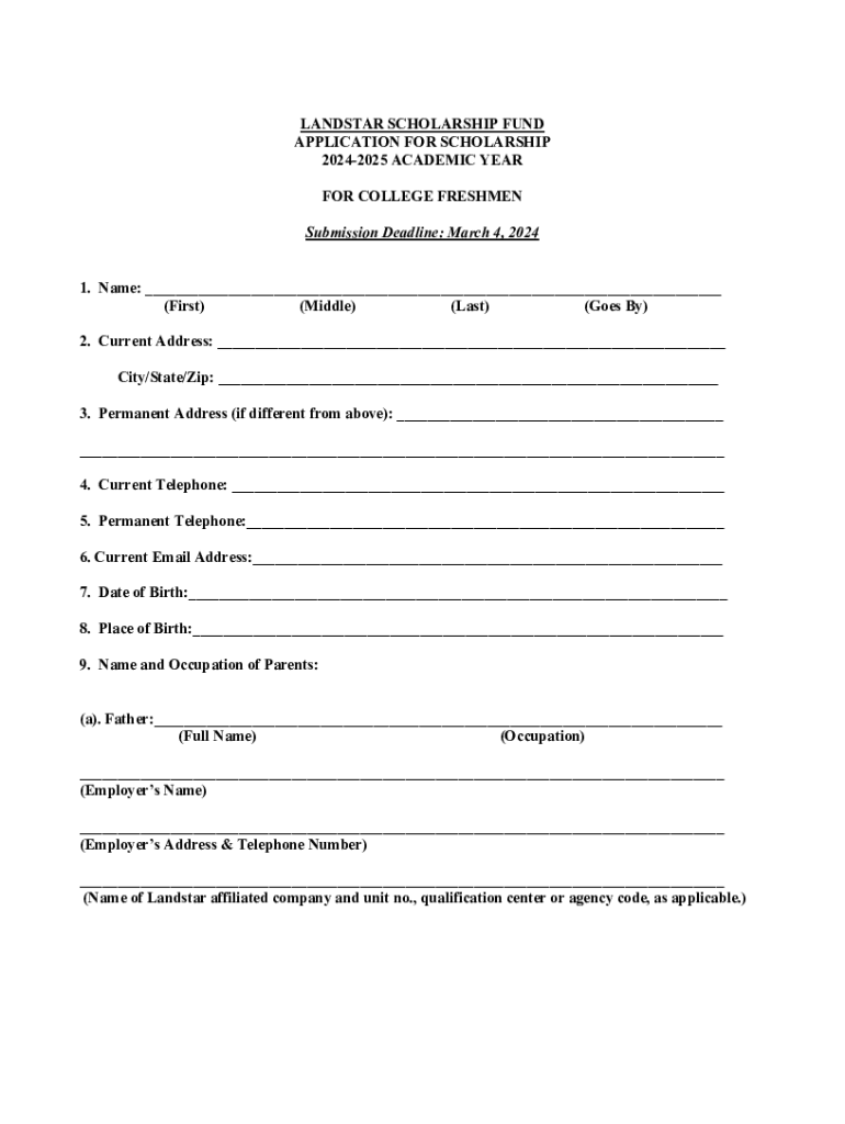LAND STAR SCHOLARSHIP FUND APPLICATION FOR SCHOLARSHIP 20242025 ACADEMIC YEAR FOR COLLEGE FRESHMEN Submission Deadline: March 4, 2024 1. Name: ___ (First) (Middle) (Last) (Goes By) 2. Current Address: