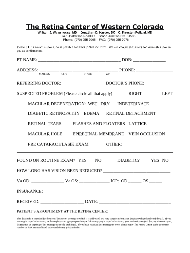The About UsThe Retina Center of Western Colorado is a document that can be completed and signed for specific needs. Next, it is provided to the relevant addressee in order to provide certain information of any kinds. The completion and signing may be done or with a suitable service e. g. PDFfiller. Such applications help to complete any PDF or Word file without printing them out. It also lets you customize it according to your requirements and put legit e-signature. Upon finishing, you send the About UsThe Retina Center of Western Colorado to the recipient or several of them by email and also fax. PDFfiller includes a feature and options that make your Word form printable. It offers different settings for printing out appearance. It does no matter how you send a form after filling it out - physically or electronically - it will always look well-designed and firm. In order not to create a new document from scratch over and over, turn the original form into a template. After that, you will have a rewritable sample.