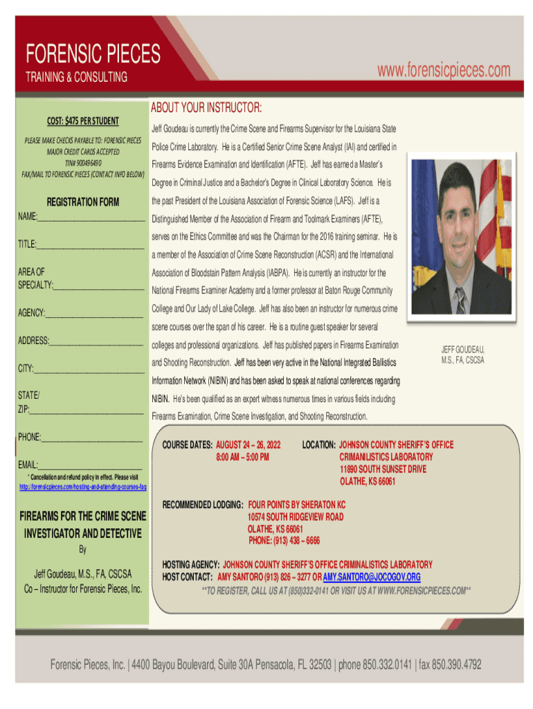 FORENSIC PIECESwww.forensicpieces.comTRAINING & CONSULTING ABOUT YOUR INSTRUCTOR: COST: $475 PER STUDENT PLEASE MAKE CHECKS PAYABLE TO: FORENSIC PIECES MAJOR CREDIT CARDS ACCEPTED TIN# 900496490 FAX/MAIL