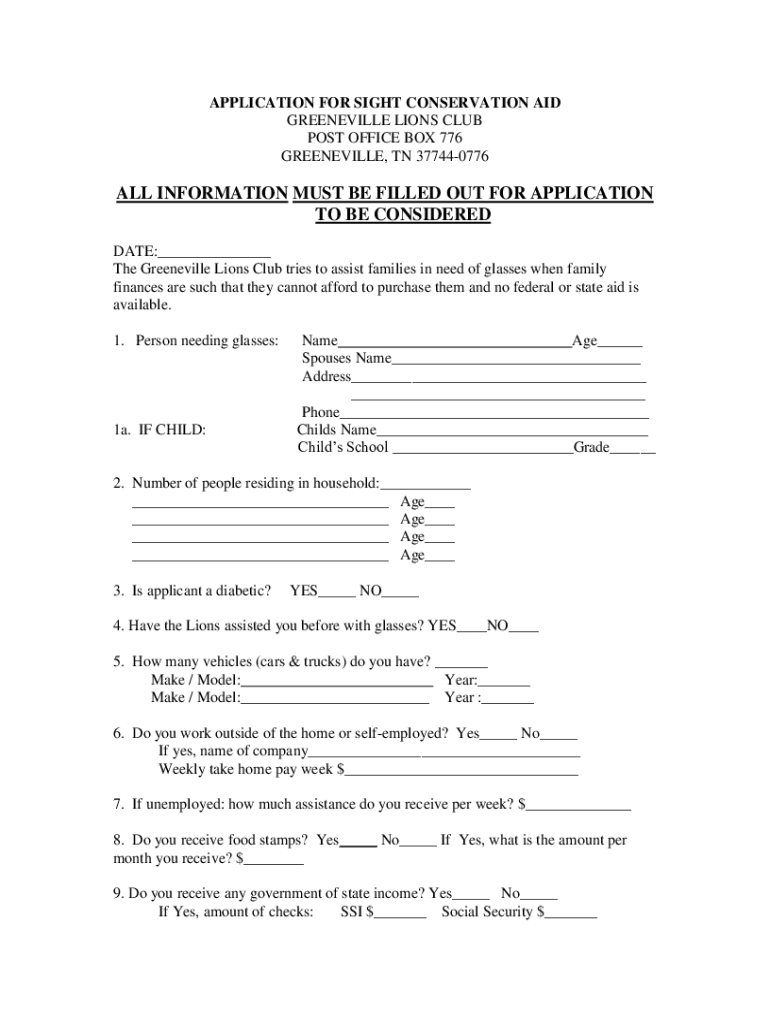 APPLICATION FOR SIGHT CONSERVATION AID GREENEVILLE LIONS CLUB POST OFFICE BOX 776 GREENEVILLE, TN 377440776ALL INFORMATION MUST BE FILLED OUT FOR APPLICATION TO BE CONSIDERED DATE:___ The Greeneville