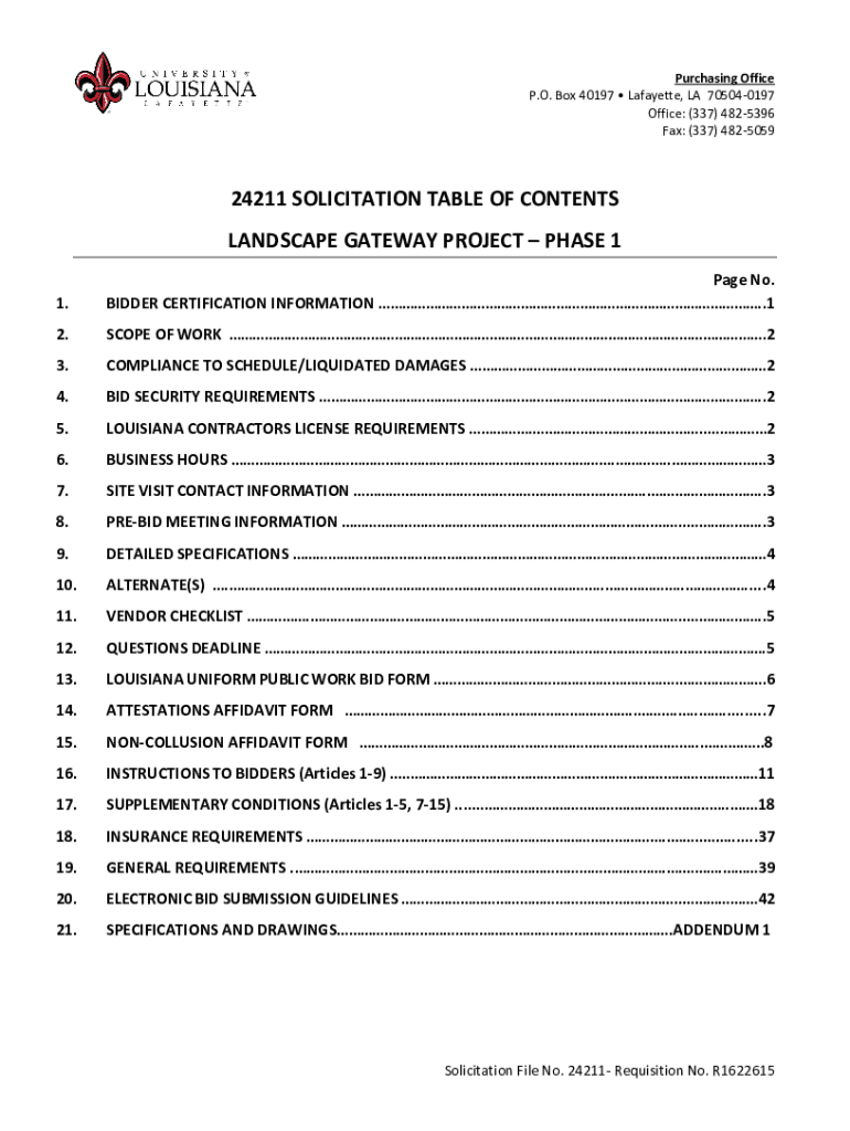 Purchasing Office P.O. Box 40197 Lafayette, LA 705040197 Office: (337) 4825396 Fax: (337) 482505924211 SOLICITATION TABLE OF CONTENTS LANDSCAPE GATEWAY PROJECT PHASE 1 1. Page No. BIDDER CERTIFICATION
