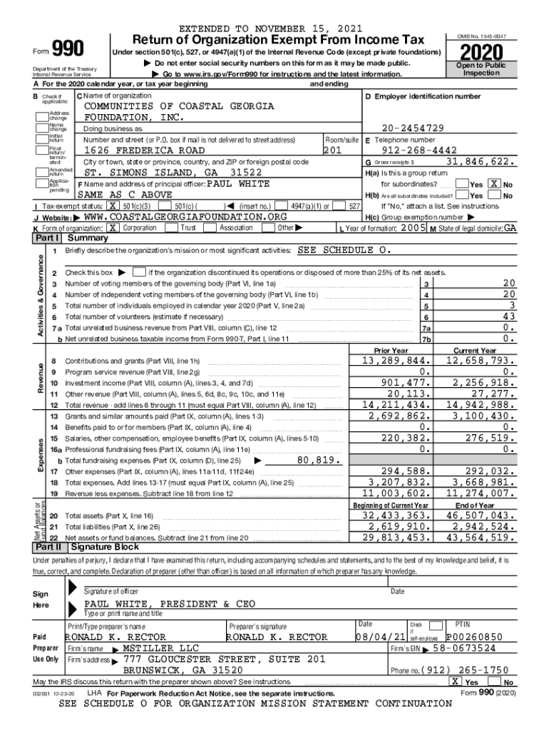EXTENDED TO NOVEMBER 15, 2021 Form990Return of Organization Exempt From Income TaxOMB No. 15450047| Do not enter social security numbers on this form as it may be made public.Open to Public Inspection2020Under