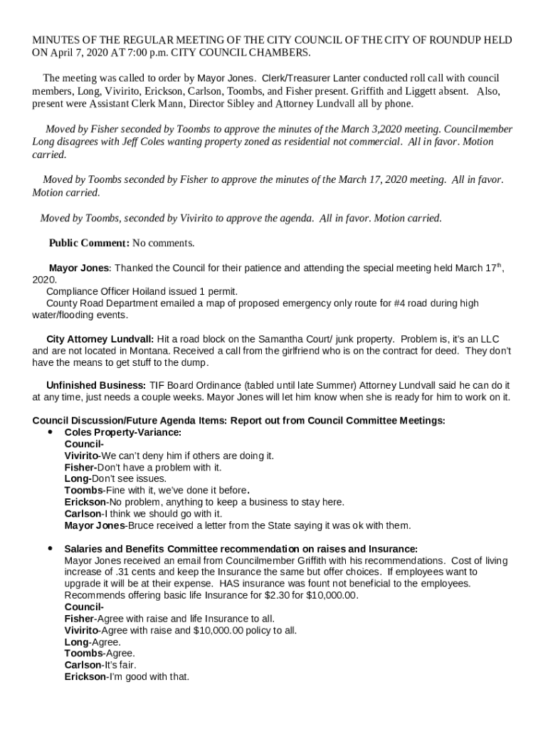Clerk/Treasurer Lanter conducted roll call with council members, Long, Vivirito, Erickson, Carlson, Toombs, and Fisher present template instructions