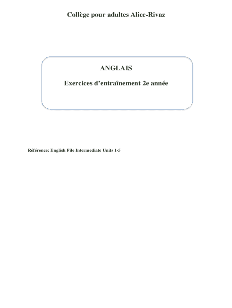 Collge pour adultes AliceRivazANGLAIS Exercices dentranement 2e anneRfrence: English File Intermediate Units 15I. Reading comprehension Read the following text and then do the exercise related to