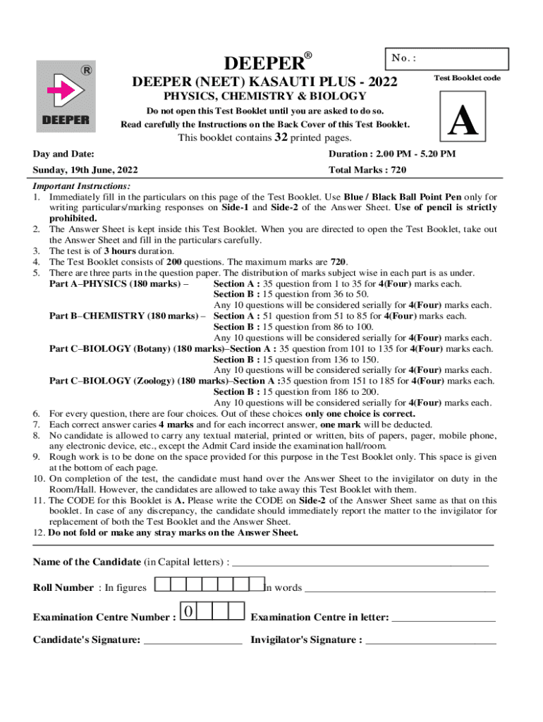 No. :DEEPERDEEPER (NEET) KASAUTI PLUS 2022Test Booklet codePHYSICS, CHEMISTRY & BIOLOGY Do not open this Test Booklet until you are asked to do so. Read carefully the Instructions on the Back Cover