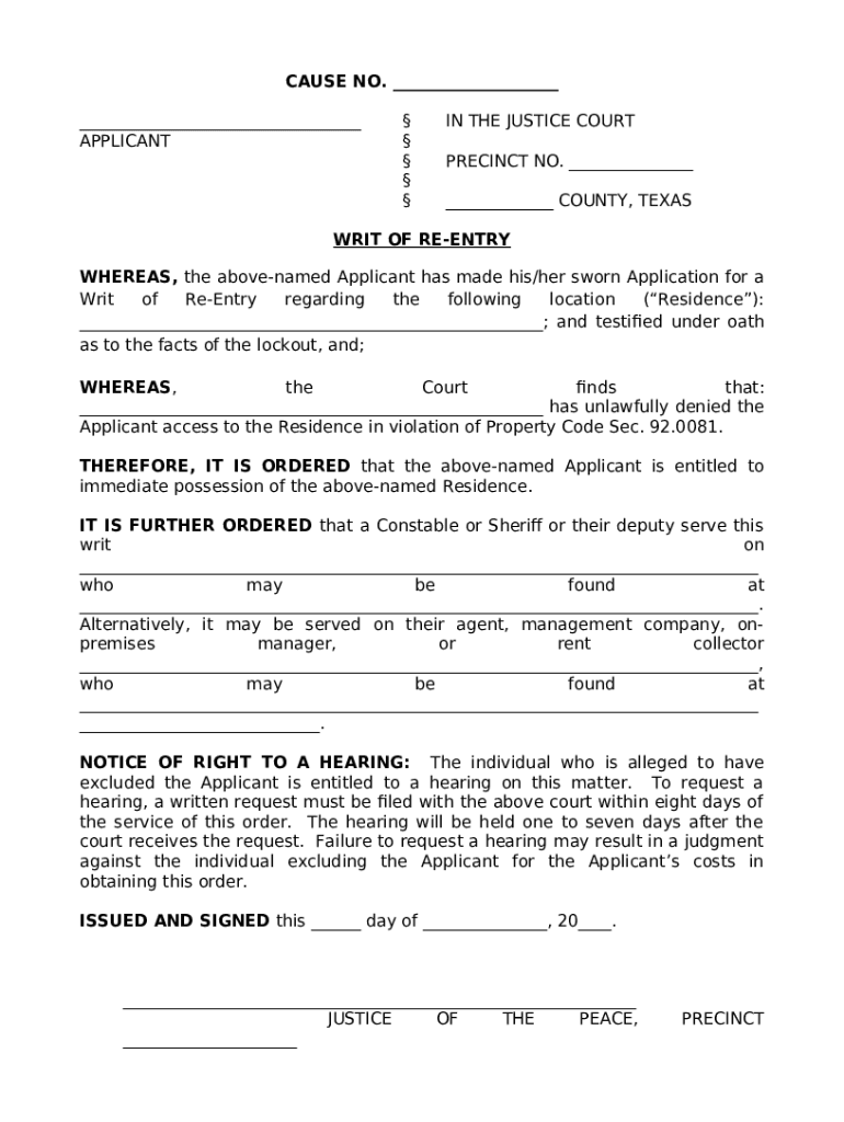 How to fill Writ of ReEntry Application - Nacogdoches County word template