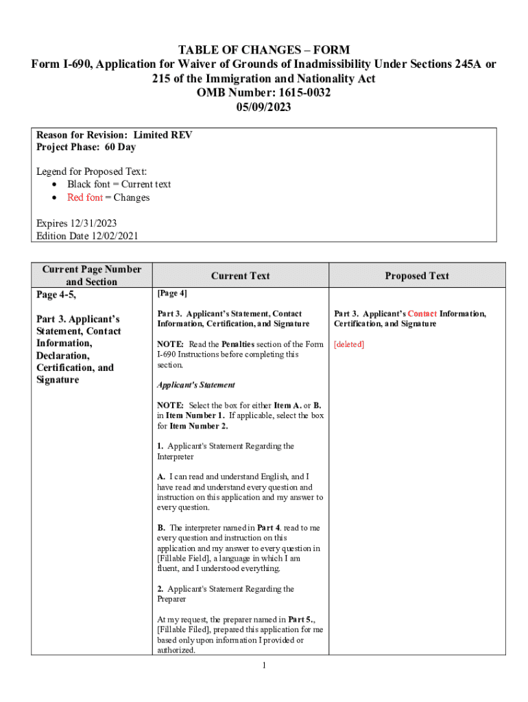 TABLE OF CHANGES FORM I690, Application for Waiver of Grounds of Inadmissibility Under Sections 245A or