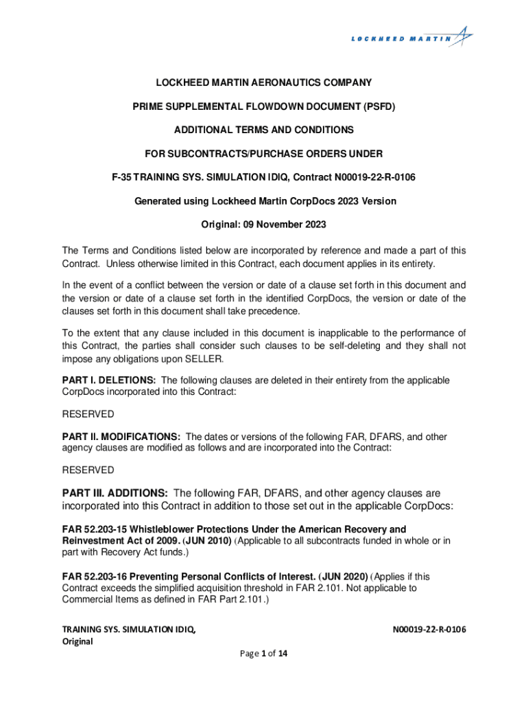 LOCKHEED MARTIN AERONAUTICS COMPANY PRIME SUPPLEMENTAL FLOWDOWN DOCUMENT (PSFD) ADDITIONAL TERMS AND CONDITIONS FOR SUBCONTRACTS/PURCHASE ORDERS UNDER F35 TRAINING SYS. SIMULATION IDIQ, Contract N0001922R0106