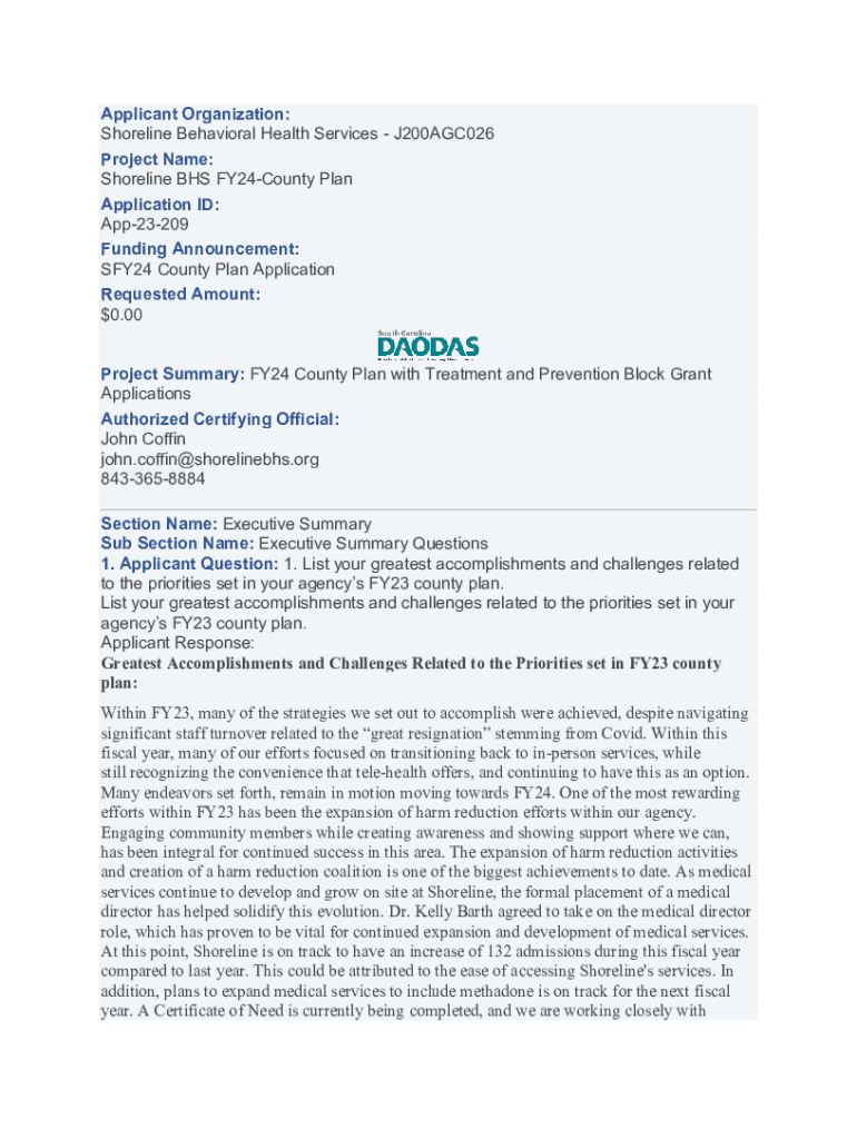 Applicant Organization: Shoreline Behavioral Health Services J200AGC026 Project Name: Shoreline BHS FY24County Plan Application ID: App23209 Funding Announcement: SFY24 County Plan Application Requested