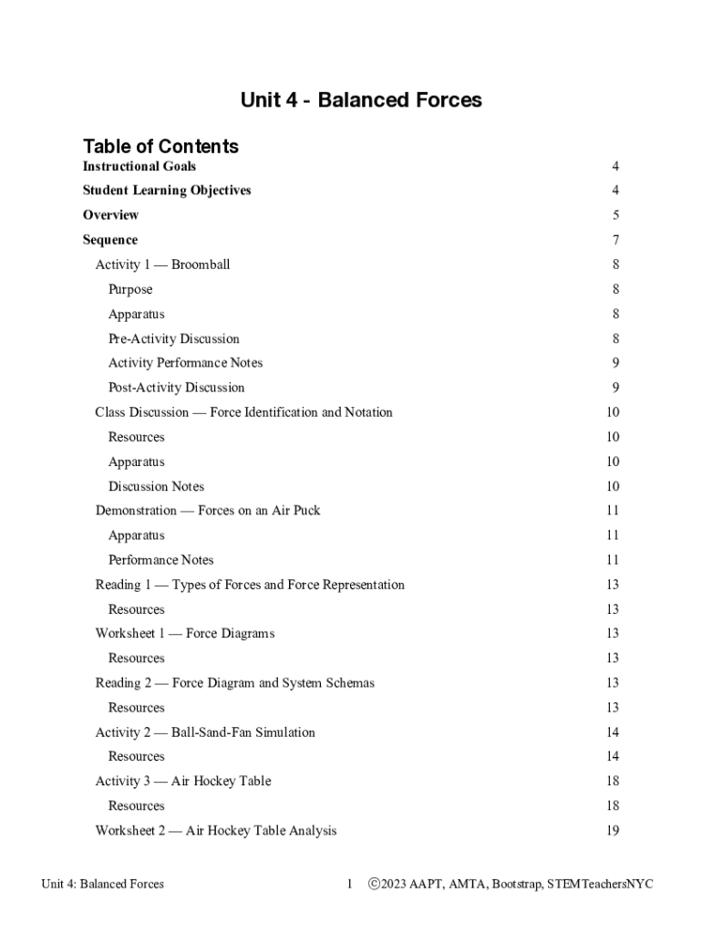 Unit 4 Balanced Forces Table of Contents Instructional Goals4Student Learning Objectives4Overview5Sequence7Activity 1 Broomball8Purpose8Apparatus8PreActivity Discussion8Activity Performance Notes9PostActivity