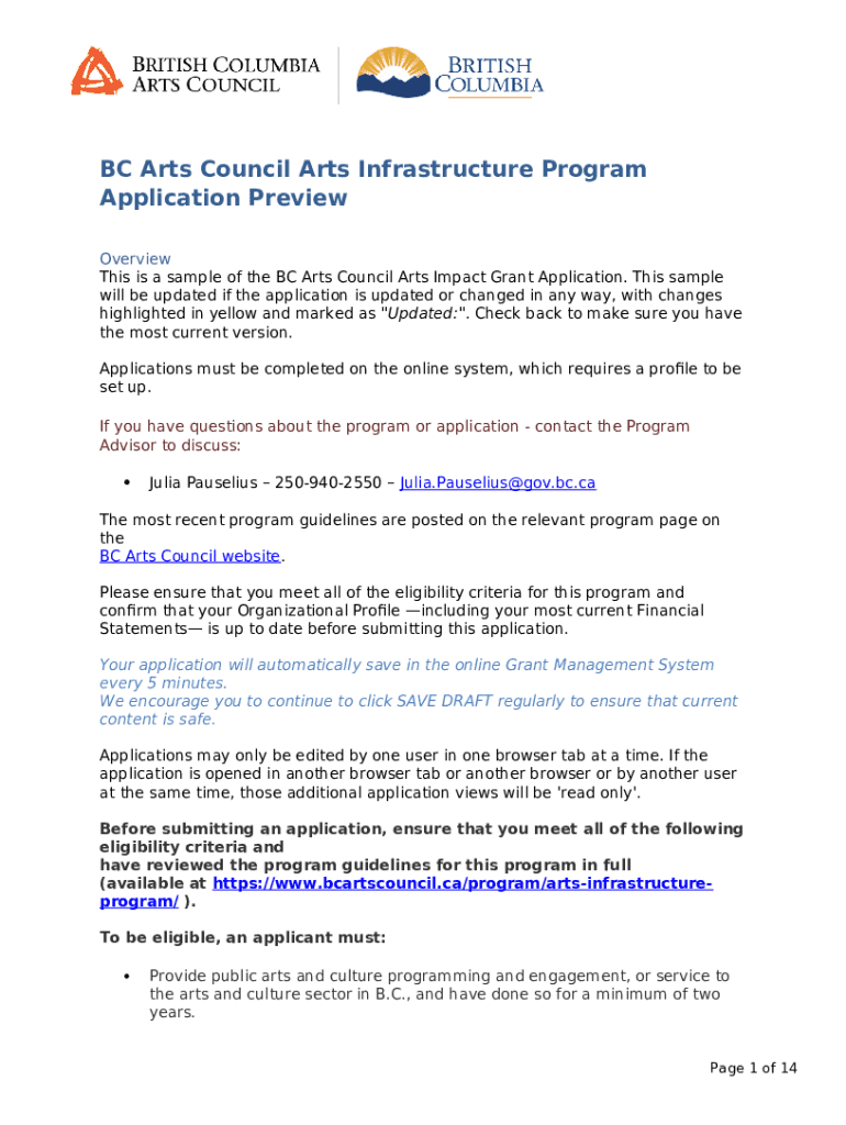 Instructions for the form Apply for the BC Arts Council's Arts Impact Grant Program ...