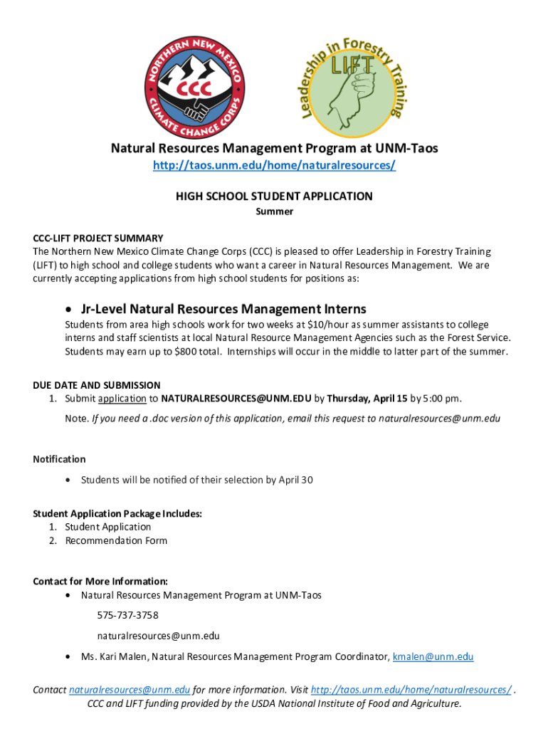 Natural Resources Management Program at UNMTaos http://taos.unm.edu/home/naturalresources/ HIGH SCHOOL STUDENT APPLICATION Summer CCCLIFT PROJECT SUMMARY The Northern New Mexico Climate Change Corps