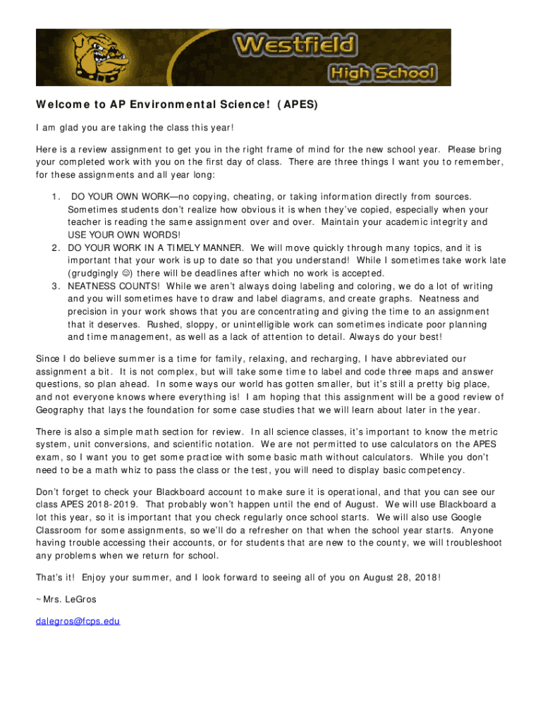 Get the free AP Environmental Science Summer Work Instructions - westfieldhs fcps