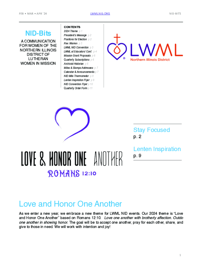 FEB MAR APR 24NIDBits A COMMUNICATION FOR WOMEN OF THE NORTHERN ILLINOIS DISTRICT OF LUTHERAN WOMEN IN MISSIONLWMLNID.ORGNIDBITSCONTENTS 2024 Theme p 1 Presidents Message p 2 Positions for Election