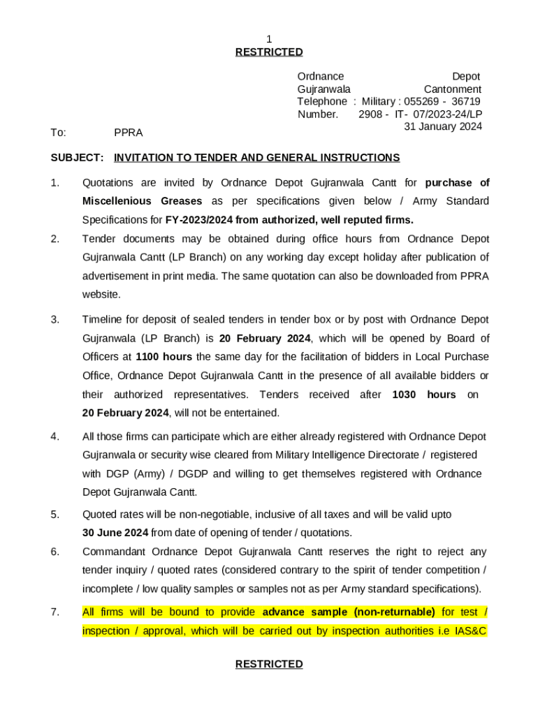 Frequently asked questions about the form Quotations are invited by Ordnance Depot Gujranwala Cantt for purchase of Miscellenious Greases as per specifications given below / Army Standard Specifications for FY-2023/2024 from authorized, well reputed firms