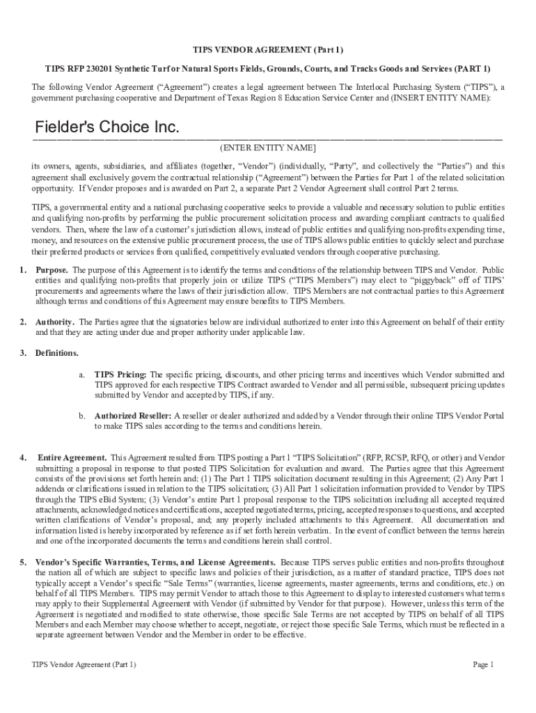 TIPS VENDOR AGREEMENT (Part 1) TIPS RFP 230201 Synthetic Turf or Natural Sports Fields, Grounds, Courts, and Tracks Goods and Services (PART 1) The following Vendor Agreement (Agreement) creates a