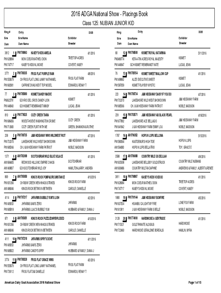 2016 ADGA National Show Placings Book Class 125: NUBIAN JUNIOR KID EntryDOBRIng #EntrySireSire NameExhibitorSireSire NameExhibitorDamDam NameBreederDamDam NameBreeder38121PN1798963DOBKASEY\'S KIDS