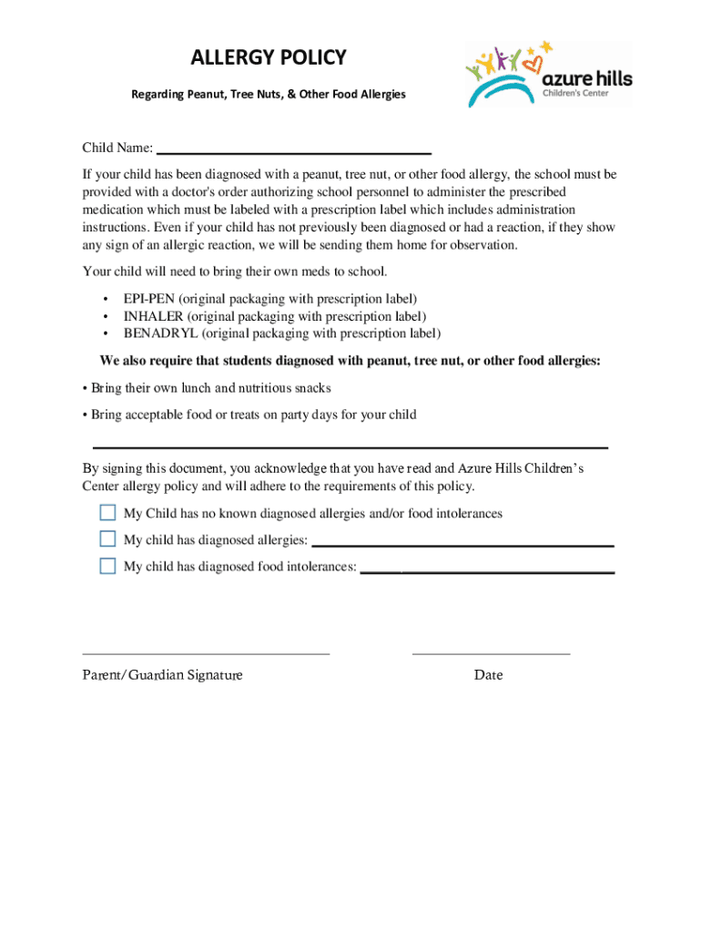 Regarding Peanut, Tree Nuts, & Other Food AllergiesChild Name: ___