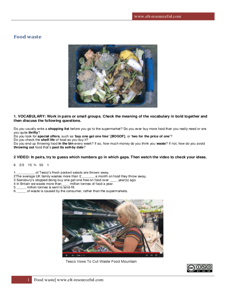 Www.eltresourceful.comFood waste1. VOCABULARY: Work in pairs or small groups. Check the meaning of the vocabulary in bold together and