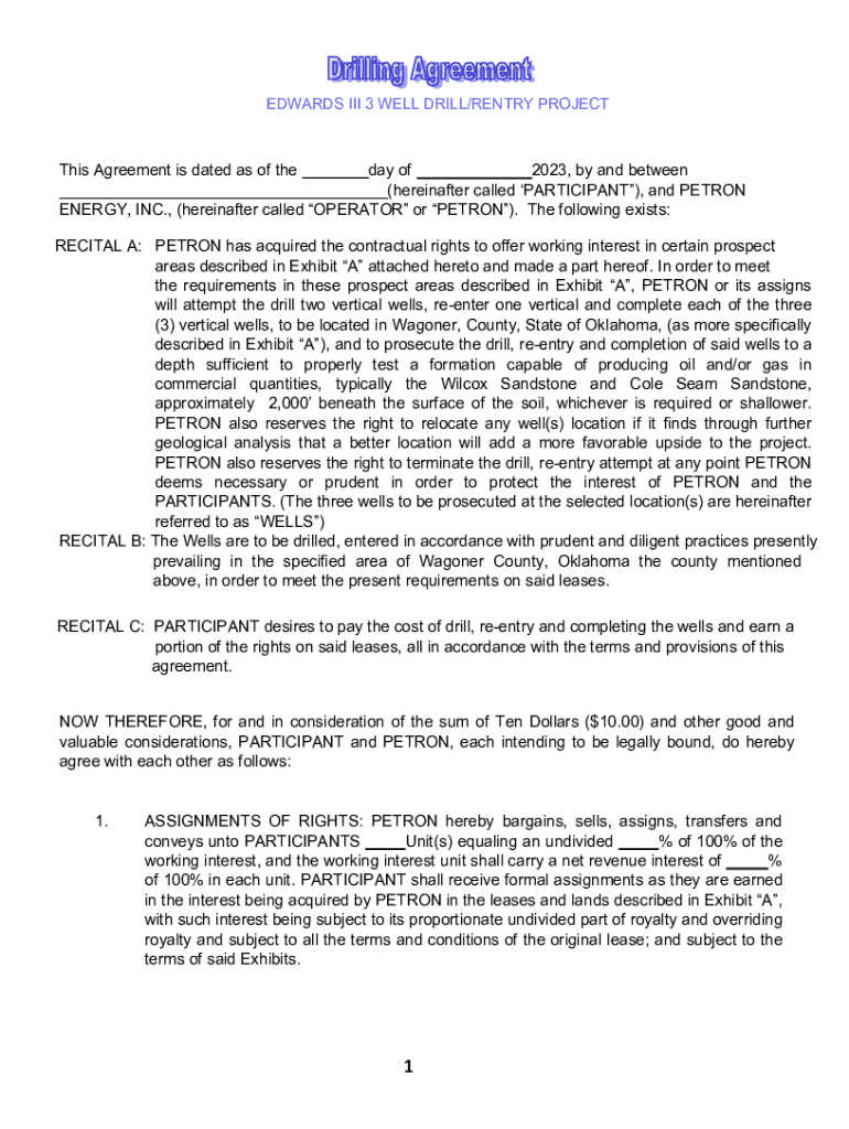 EDWARDS III 3 WELL DRILL/RENTRY PROJECTThis Agreement is dated as of the day of 2023, by and between ___(hereinafter called PARTICIPANT), and PETRON ENERGY, INC., (hereinafter called OPERATOR or PETRON).