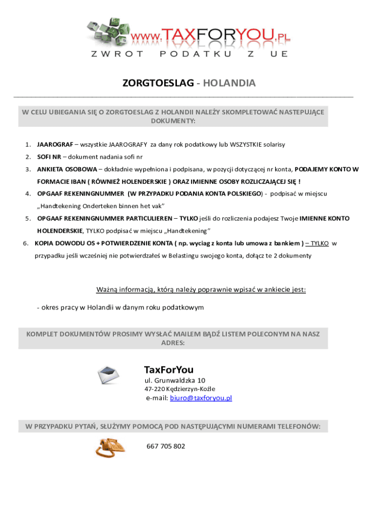 ZORGTOESLAG HOLANDIA ___ W CELU UBIEGANIA SI O )ORGTOESLAG Z HOLANDII NALEY SKOMPLETOWA NASTEPUJCE DOKUMENTY: 1. JAAROGRAF wszystkie JAAROGRAFY za dany rok podatkowy lub WSZYSTKIE solarisy 2. SOFI