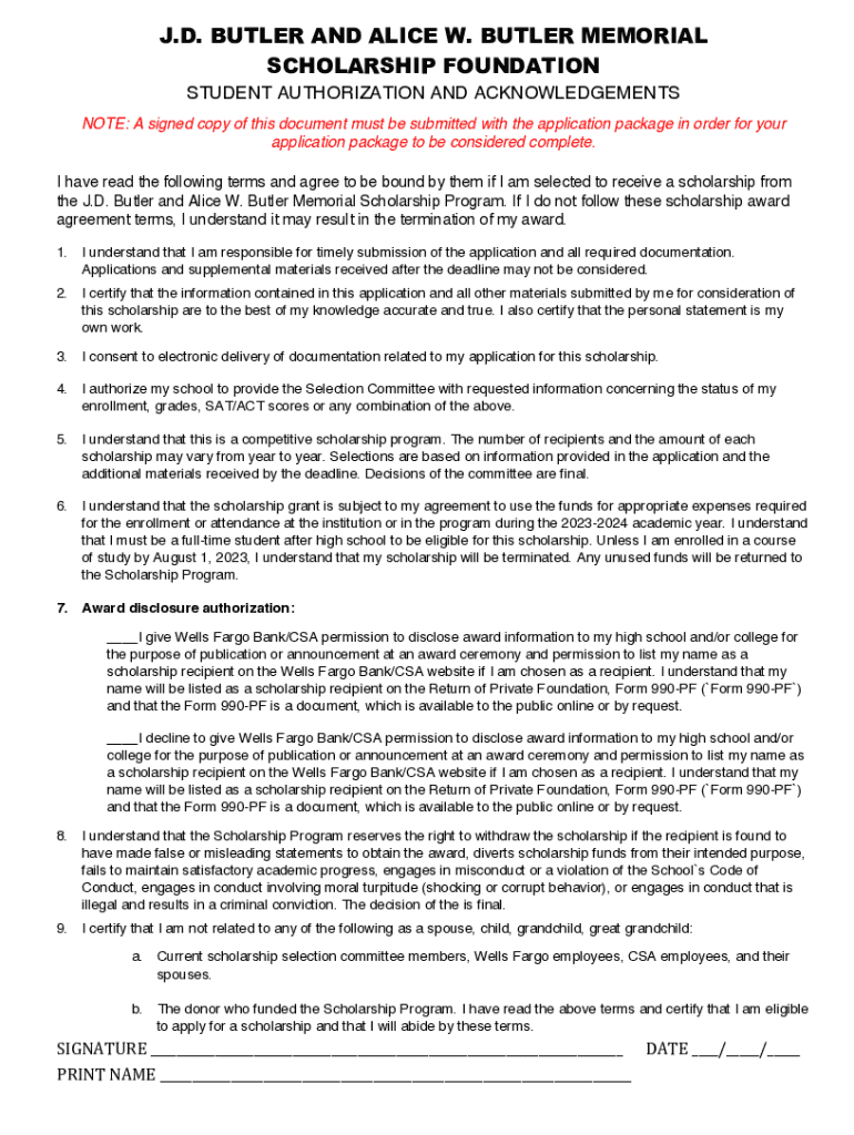J.D. BUTLER AND ALICE W. BUTLER MEMORIAL SCHOLARSHIP FOUNDATION STUDENT AUTHORIZATION AND ACKNOWLEDGEMENTS NOTE: A signed copy of this document must be submitted with the application package in order