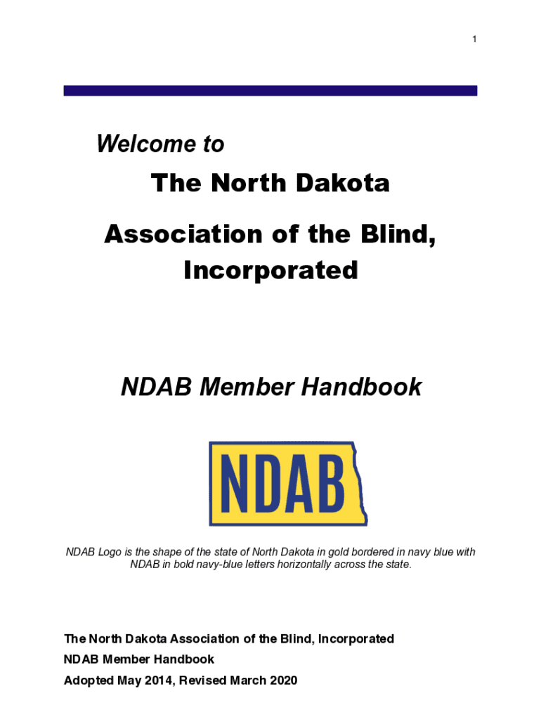 1Welcome toThe North Dakota Association of the Blind, IncorporatedNDAB Member HandbookNDAB Logo is the shape of the state of North Dakota in gold bordered in navy blue with NDAB in bold navyblue letters
