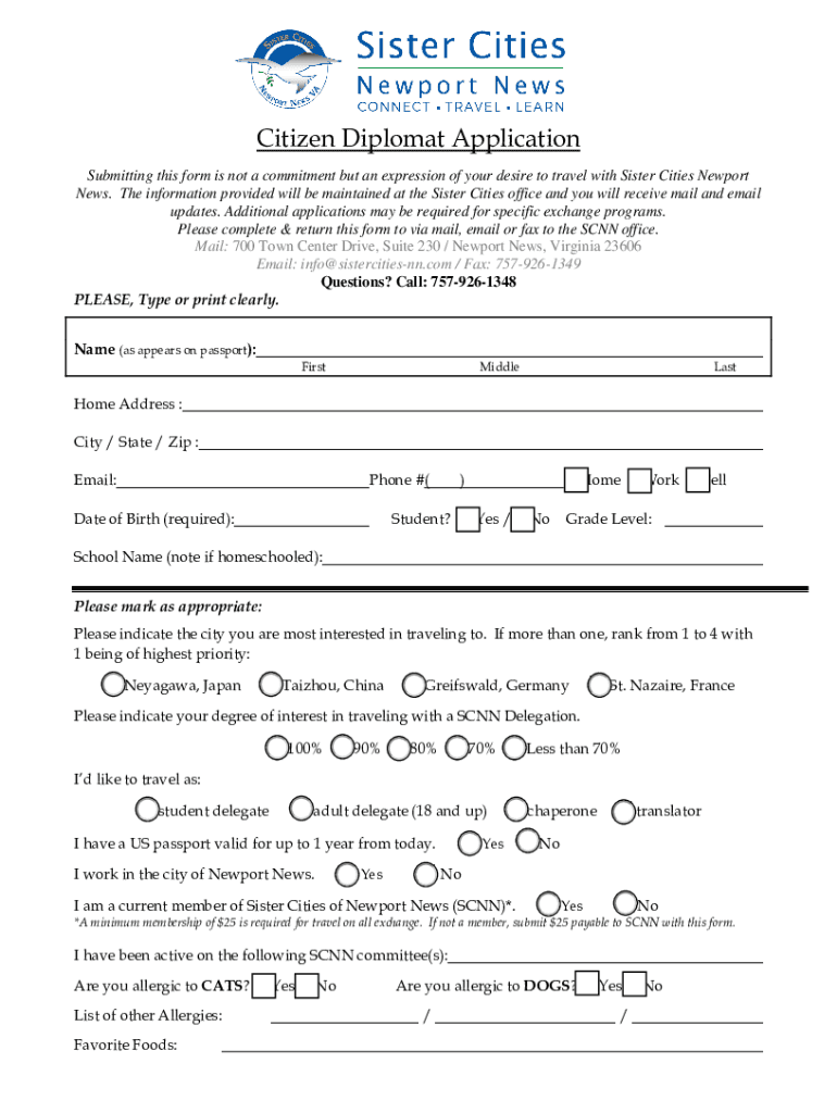 Citizen Diplomat Application Submitting this form is not a commitment but an expression of your desire to travel with Sister Cities Newport News. The information provided will be maintained at the
