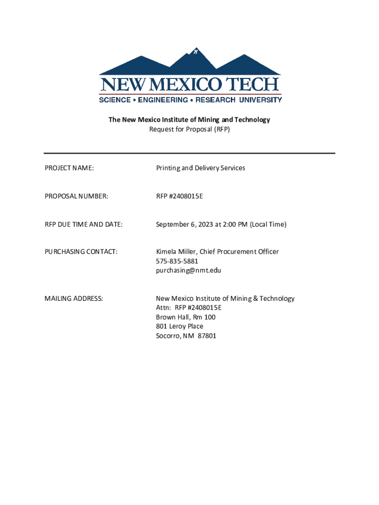 The New Mexico Institute of Mining and Technology Request for Proposal (RFP)PROJECT NAME:Printing and Delivery ServicesPROPOSAL NUMBER:RFP #2408015ERFP DUE TIME AND DATE:September 6, 2023 at 2:00