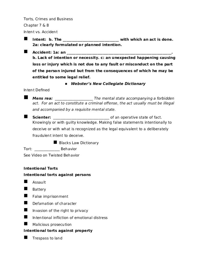 How to fill Torts, Crimes and Business Chapter 7 & 8. Intent vs. ... word template