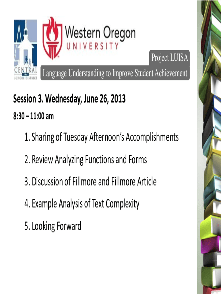 Project LUISA Language Understanding to Improve Student AchievementSession 3. Wednesday, June 26, 2013 8:30 11:00 am1. Sharing of Tuesday Afternoons Accomplishments2. Review Analyzing Functions and