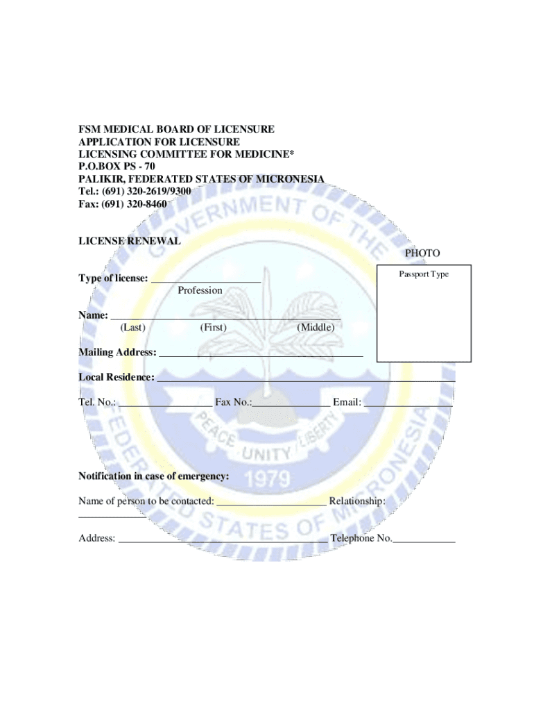 FSM MEDICAL BOARD OF LICENSURE APPLICATION FOR LICENSURE LICENSING COMMITTEE FOR MEDICINE* P.O.BOX PS 70 PALIKIR, FEDERATED STATES OF MICRONESIA Tel.: (691) 3202619/9300 Fax: (691) 3208460LICENSE