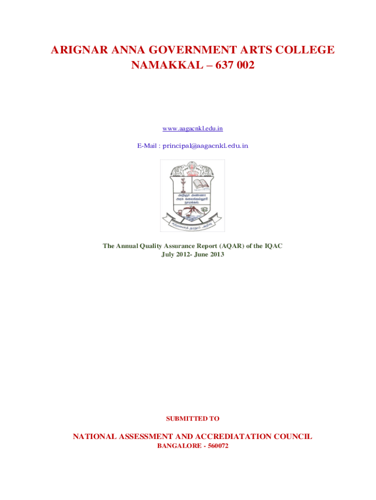 ARIGNAR ANNA GOVERNMENT ARTS COLLEGE NAMAKKAL 637 002www.aagacnkl.edu.in EMail : principal@aagacnkl.edu.inThe Annual Quality Assurance Report (AQAR) of the IQAC July 2012 June 2013SUBMITTED TONATIONAL