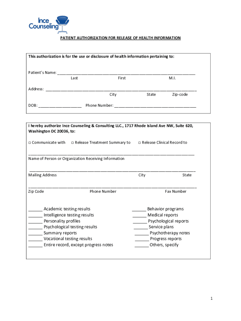 PATIENT AUTHORIZATION FOR RELEASE OF HEALTH INFORMATIONThis authorization is for the use or disclosure of health information pertaining to:Patients Name: ___LastFirstM.I.Address:___CityStateZipcodeDOB: