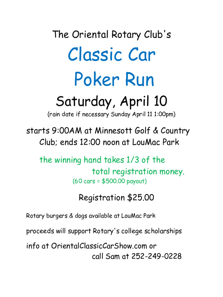 The Oriental Rotary Club\'sClassic Car Poker Run Saturday, April 10(rain date if necessary Sunday April 11 1:00pm)starts 9:00AM at Minnesott Golf & Country Club; ends 12:00 noon at LouMac Park the