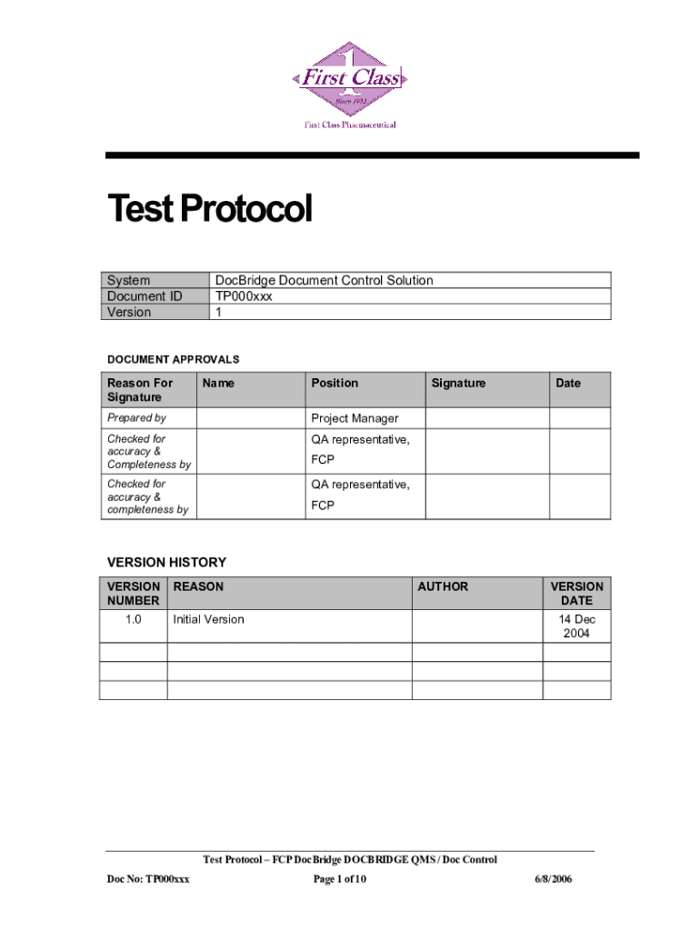 Test Protocol System Document ID VersionDocBridge Document Control Solution TP000xxx 1DOCUMENT APPROVALSReason For SignatureNamePositionPrepared byProject ManagerChecked for accuracy & Completeness