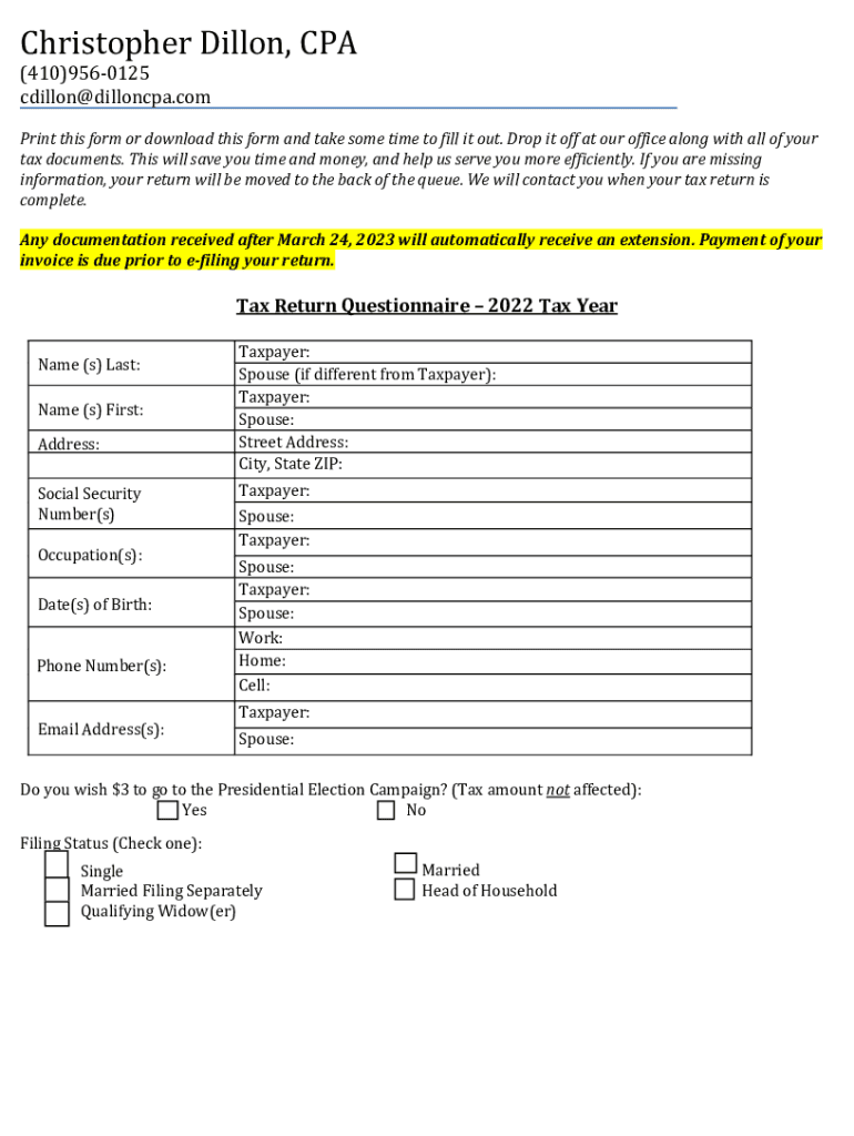 cdillon@dilloncpa.comPrint this form or download this form and take some time to fill it out. Drop it off at our office along with all of your