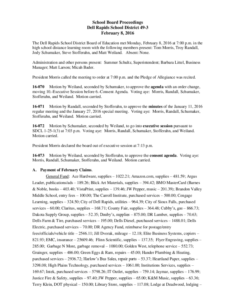 School Board Proceedings Dell Rapids School District 493 February 8, 2016 The Dell Rapids School District Board of Education met Monday, February 8, 2016 at 7:00 p.m. in the high school distance learning