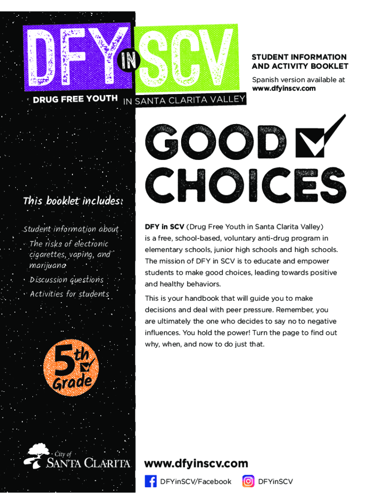 STUDENT INFORMATION AND ACTIVITY BOOKLET Spanish version available at www.dfyinscv.comThis booklet includes: Student information about The risks of electroniccigarettes, vaping, and marijuana Discussion
