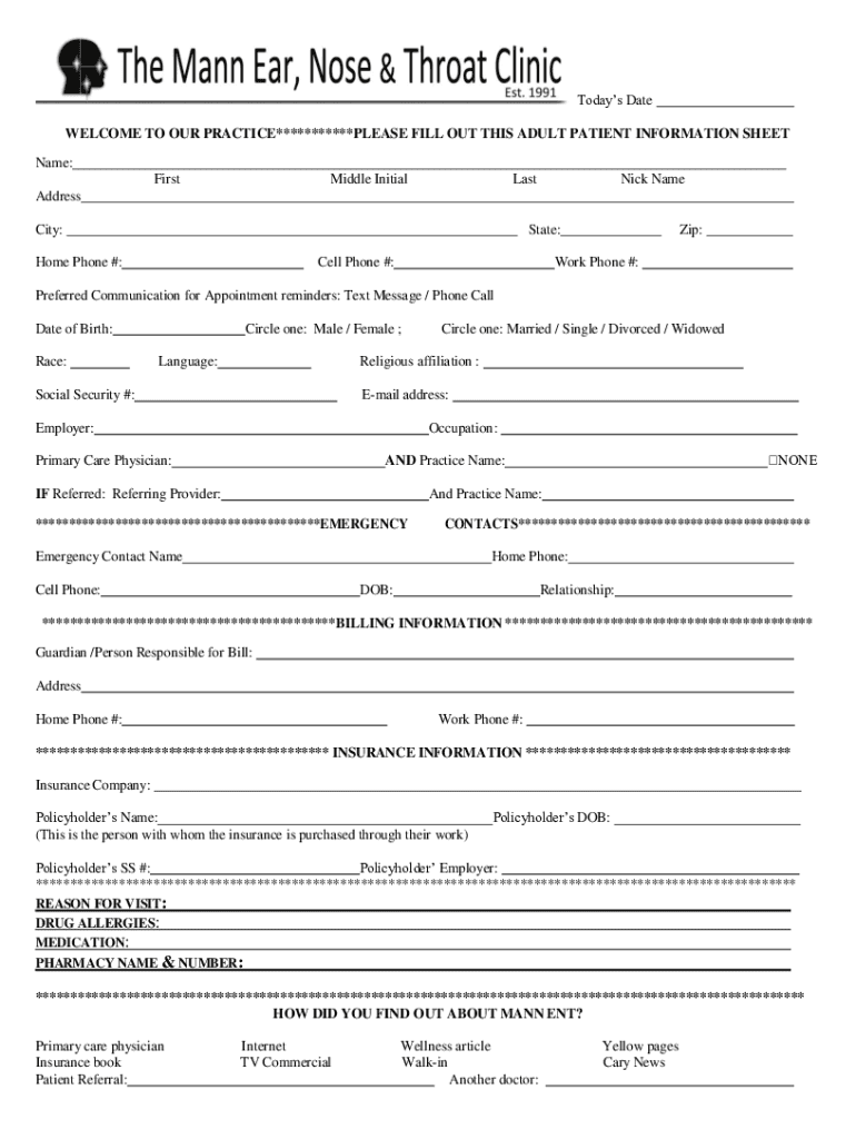 Todays Date WELCOME TO OUR PRACTICE***********PLEASE FILL OUT THIS ADULT PATIENT INFORMATION SHEET Name: FirstMiddle InitialLastNick NameAddress City:State:Home Phone #:Cell Phone #:Zip:Work Phone