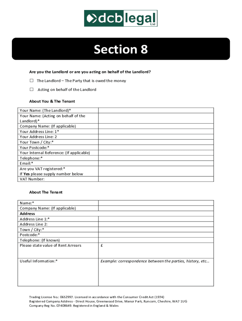 Section 8 Are you the Landlord or are you acting on behalf of the Landlord? The Landlord The Party that is owed the money Acting on behalf of the Landlord About You & The Tenant Your Name: (The Landlord)*