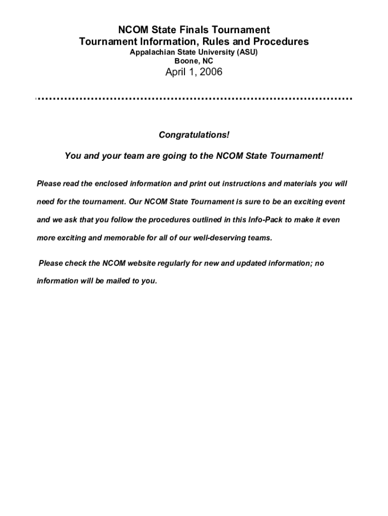 NCOM State Finals Tournament Tournament Information, Rules and Procedures Appalachian State University (ASU) Boone, NCApril 1, 2006Congratulations! You and your team are going to the NCOM State Tournament!