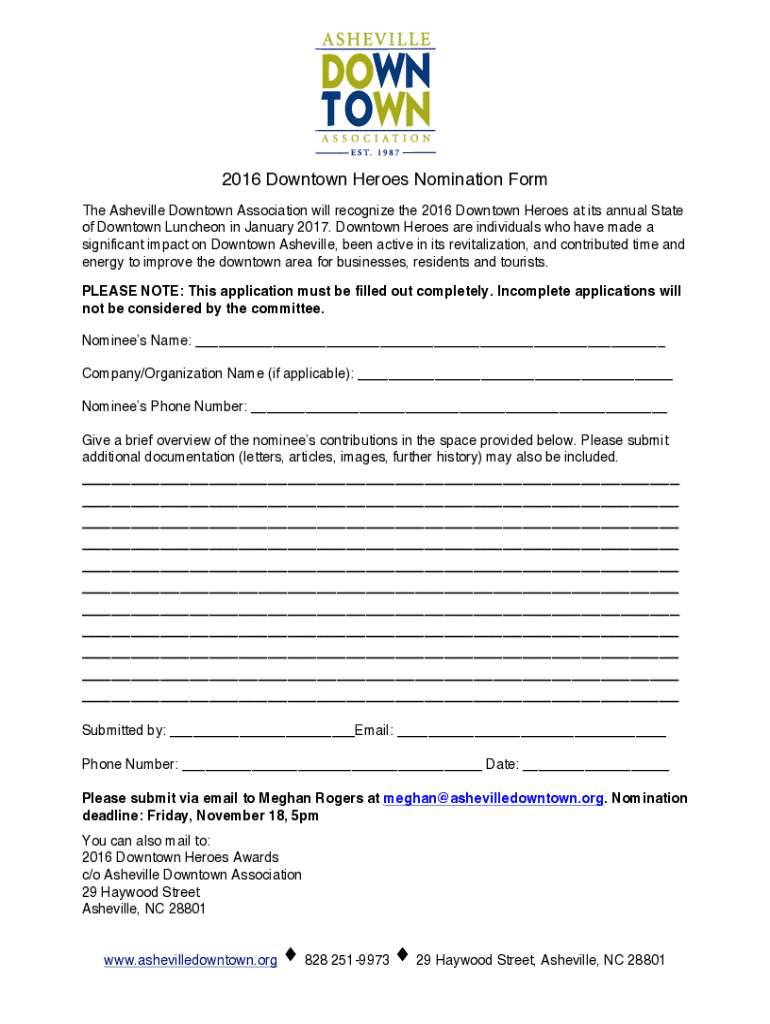 2016 Downtown Heroes Nomination Form The Asheville Downtown Association will recognize the 2016 Downtown Heroes at its annual State of Downtown Luncheon in January 2017. Downtown Heroes are individuals