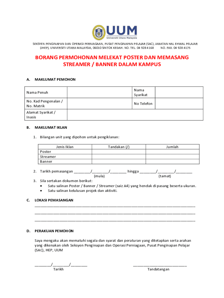SEKSYEN PENGINAPAN DAN OPERASI PERNIAGAAN, PUSAT PENGINAPAN PELAJAR (SAC), JABATAN HAL EHWAL PELAJAR (JHEP), UNIVERSITI UTARA MALAYSIA, 06010 SINTOK KEDAH. NO. TEL. 04 928 4168 NO. FAX. 04 928 4175BORANG