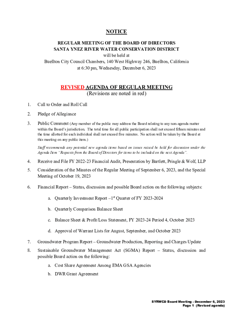 NOTICE REGULAR MEETING OF THE BOARD OF DIRECTORS SANTA YNEZ RIVER WATER CONSERVATION DISTRICT will be held at Buellton City Council Chambers, 140 West Highway 246, Buellton, California at 6:30 pm,