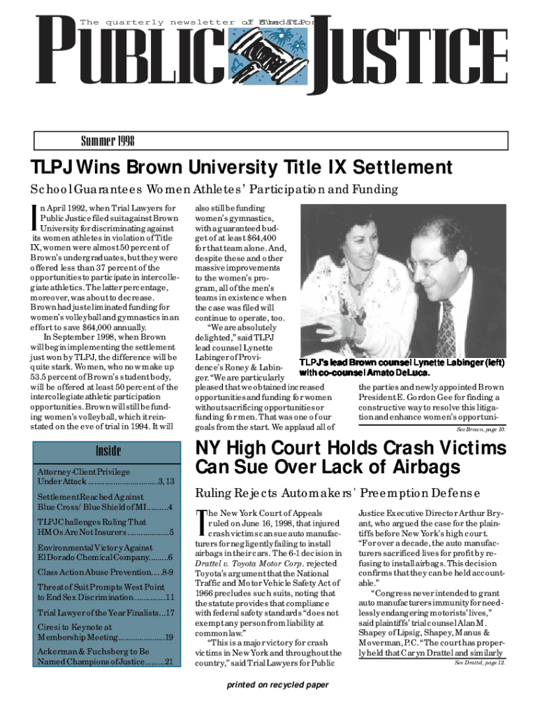 PUBLIC JUSTICE The quarterly newsletter of J F oundation The TLPSummer 1998TLPJ Wins Brown University Title IX Settlement School Guarantees Women Athletes Participation and Funding n April 1992, when