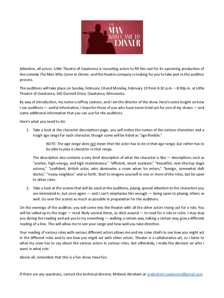 Attention, all actors. Little Theatre of Owatonna is recruiting actors to fill the cast for its upcoming production of the comedy The Man Who Came to Dinner, and the theatre company is looking for