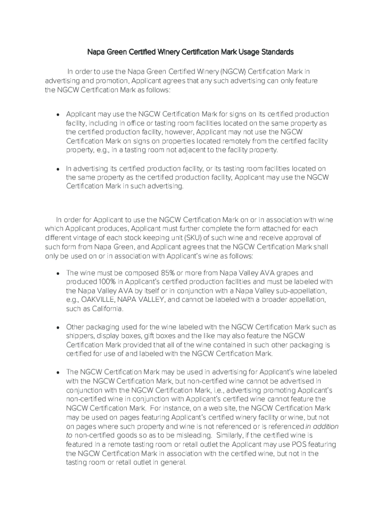 Napa Green Certified Winery Certification Mark Usage Standards In order to use the Napa Green Certified Winery (NGCW) Certification Mark in advertising and promotion, Applicant agrees that any such