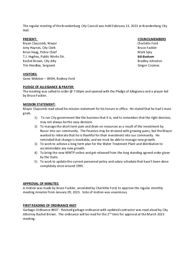 The regular meeting of the Brandenburg City Council was held February 13, 2023 at Brandenburg City Hall. PRESENT: Bryan Claycomb, Mayor Amy Haynes, City Clerk Brian Haag, Police Chief T.J. Hughes,